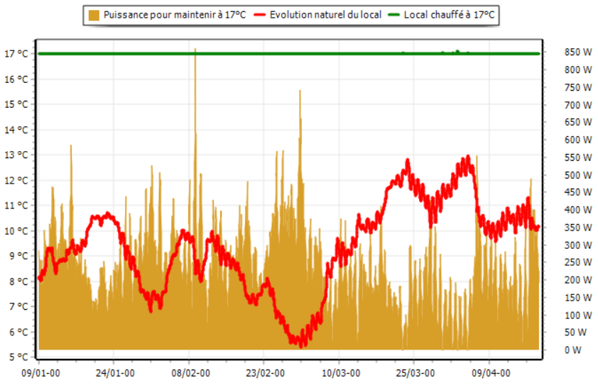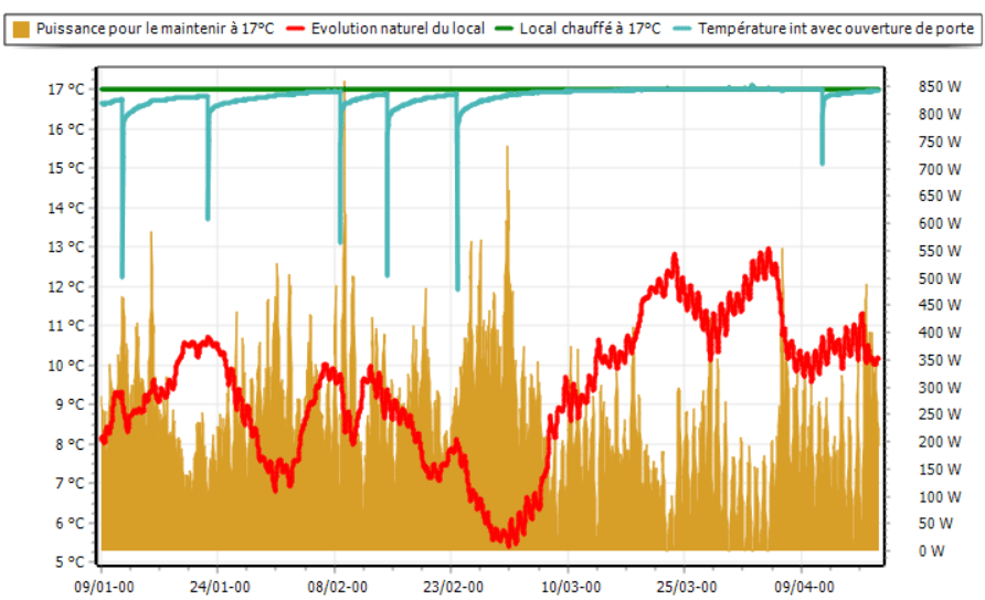 Prenons un local isolé (1). Observons-le lorsqu’il est la merci du climat et de ses évolutions (2). (3) Imposons-lui une température de consigne par exemple 17°C pour connaître le besoin de chauffage le plus juste et une puissance d’émission à installer. Ajoutons un scénario à l’ouverture d’une porte sur l’extérieur (4) de façon arbitraire. Observons ce qui se passe au niveau des températures et des puissances.
