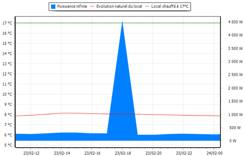 Pour maintenir la température de 17°C alors que la porte est ouverte, on passe alors en mode « puissance infinie » ou quoi qu’il arrive, l’outil de calcul comblera le besoin. L’écart entre les puissances est considérable : lorsque la porte est ouverte, le pic monte à 4500W (puissance infinie). Alors qu’il est de 230W pour maintenir une température stable sans ouvrir la porte, soit un rapport de 1 à 20.